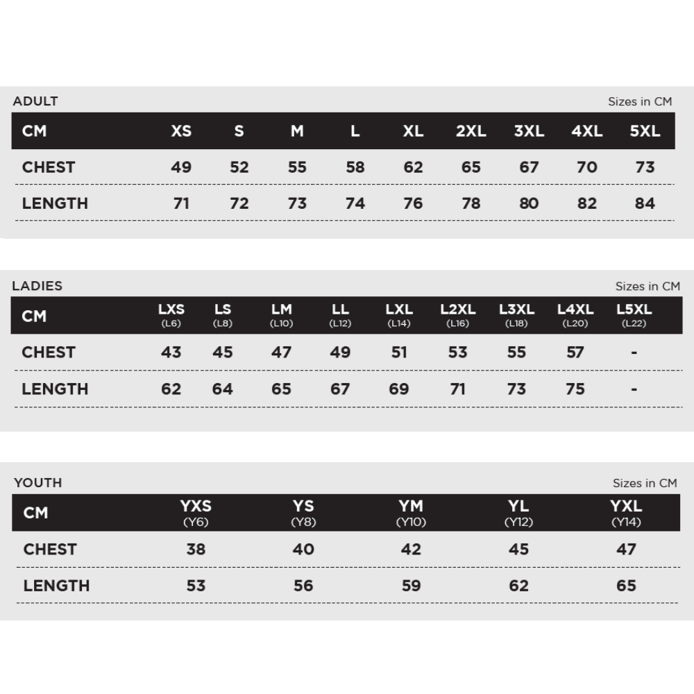 Standard Sizing: Adult: XS-5XL / Youth: YXS-YXL / Ladies: LXS-L5XL