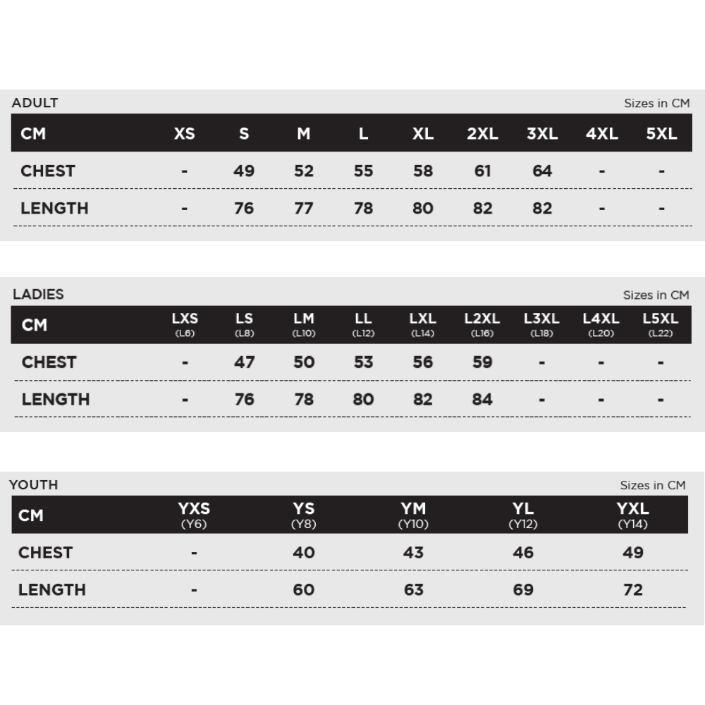 Standard Sizing: Adult: XS-5XL / Ladies: LXS-L5XL / Youth: YXS-YXL