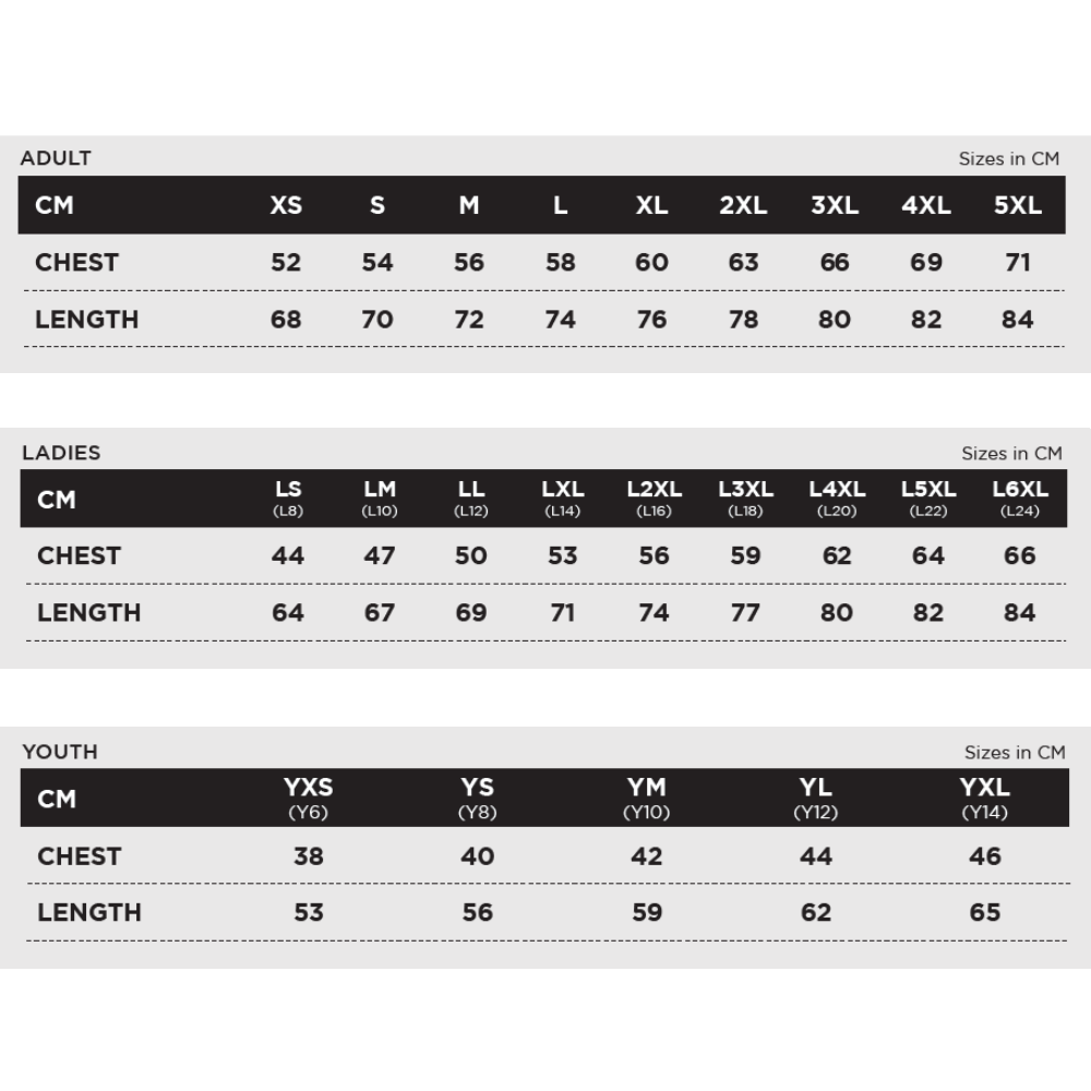 Standard Sizing: Adult: XS-5XL / Youth: YXS-YXL / Ladies: LS-L6XL